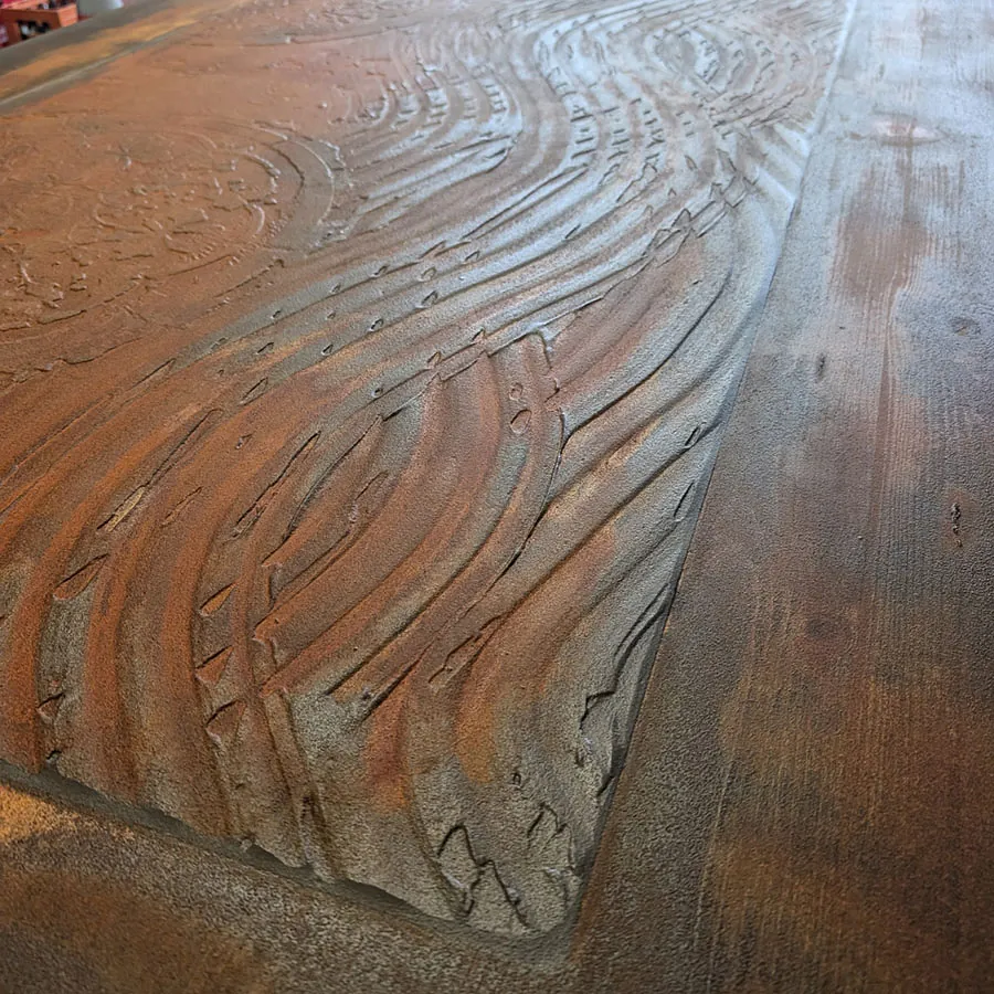 Rost-, Beton- und Marmoreffekte setzen markante Highlights – unverwechselbare Oberflächen, die optisch faszinieren und fühlbar erlebbar sind, jedes Stück ein einzigartiges Unikat